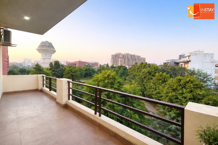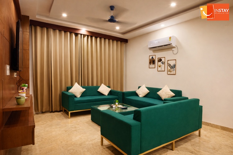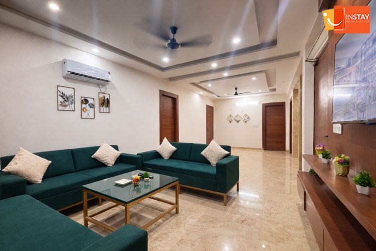 Spacious 3BHK with a cozy living area, 65” Smart TV & relaxing jhula — perfect for unwinding, enjoying your favorite shows, and spending quality time with your loved ones.